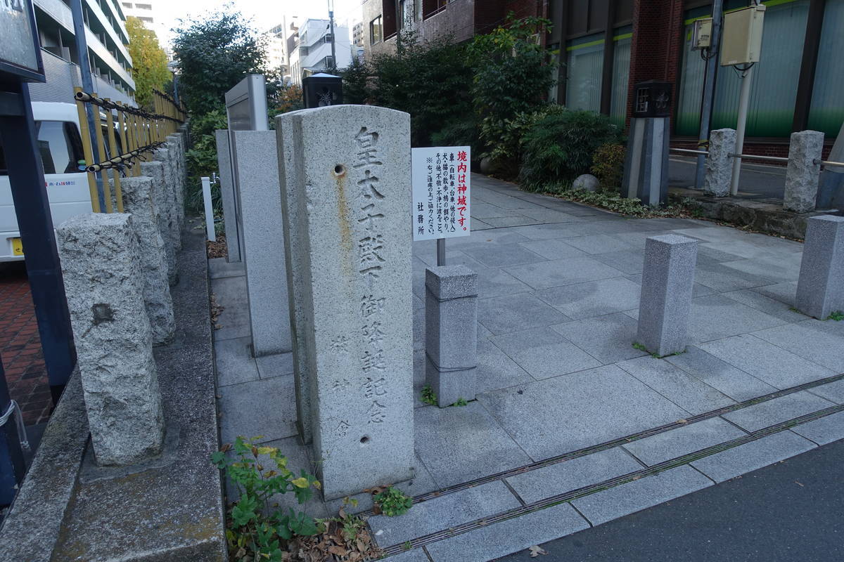 境内は見どころ満載で、多くの神様が祀られており参拝も楽しかったです。それにしても、写真でお分かりと思いますが、社殿に隣接してマンションなどの高層建物が建っているのも大都会の風景かも知れませんね。マンションの住人と思われる数人の方が、境内を突っ切って公道に出ているのを見かけました。境内が生活道路化している?逆に参拝者がマンション敷地に入らないようにこんなものが。