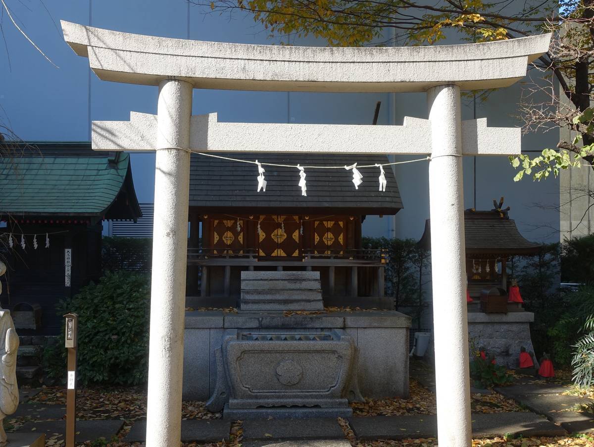 ▼結構長い参道の奥に鳥居が見えます。参道両脇は高層ビル(マンションかな?)です。新宿らしいと言えばらしい風景です。